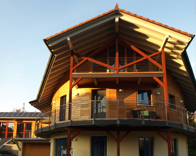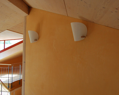 Die letztendlich realisierte Gebäudeform und Struktur ergibt sich aus dem individuellen Bedürfnis der Bauherrenfamilie nach Schutz und Geborgenheit. Die vielfältige Verwendung von Lehm als Baustoff (Lehmwände mit Lehmputz, Deckenfüllungen aus Lehm), unbehandeltem oder geöltem Holz, Naturdämmstoffe ohne Folien erzeugen ein wohltuendes, gesundheitsförderndes Raumklima mit optimaler Raumluftfeuchte, angenehmen Temperaturen im Sommer und wohliger Wärme im Winter.