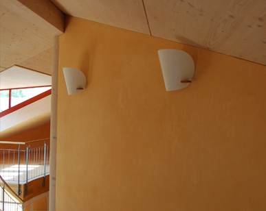 Die Außenwände sind raumseitig mit einer Lehmvorsatzschale versehen, die Innenwände komplett mit Lehmsteinen gemauert. Die Zwischenräume der Holzbalkendecken wurden mit einer Lehmschüttung verfüllt.