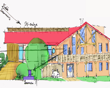 Neubau eines energieautarken Wohngebäudes in Lehmbauweise mit Büro- und Gewerberäumen in Ortsrandlage.