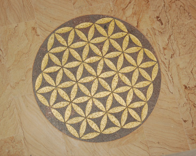 Zur Aktivierung des Herzpunkts wurde eine Steinplatte mit geomantischem Muster und Kristallen im Zentrum des Gebäudes eingebaut.