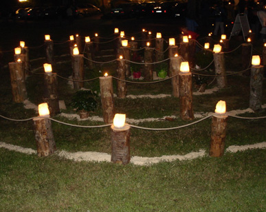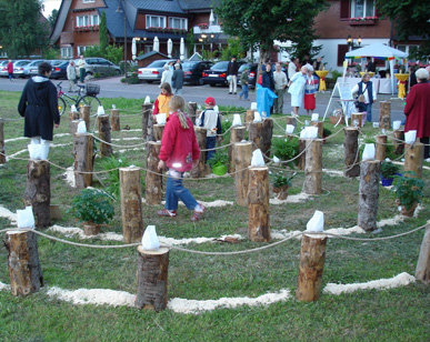 Eine Attraktion für kleine und große Besucher ist das Durchschreiten eines Labyrinths, hier einmal mit Pflanzen bzw. Holz und Feuer gestaltet.
