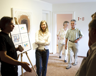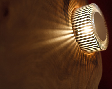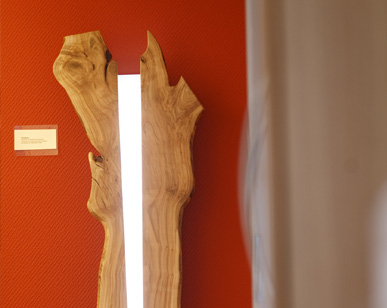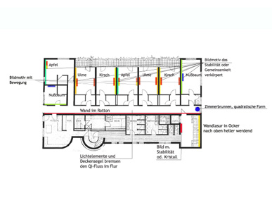 Die Energien der Baumarten „Nussbaum“, „Kirsche“, „Ulme“ und „Apfel bzw. Birne“ werden in Material, Deko und Farbe erlebbar gemacht und setzen sich in den Lichtelementen der Flure fort.