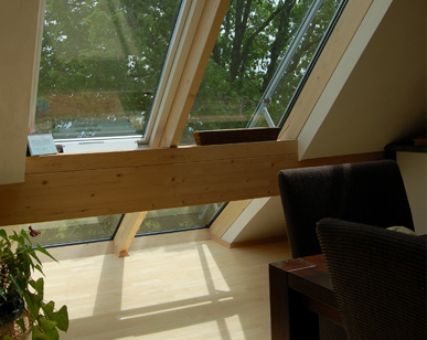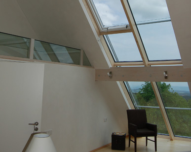 Die Belichtung der Wohnungen erfolgt weitgehend über eine ca. 16,0 m lange Schrägverglasung, welche gleichzeitig einen einzigartigen Blick auf das gesamte schweizer Alpenpanorama ermöglicht.