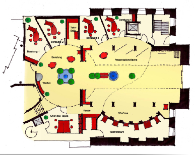 Als Vorgabe für die Entwurfsplanung wurde eine geomantische und baubiologische Analyse der Kundenhalle und der Beraterbüros durchgeführt.